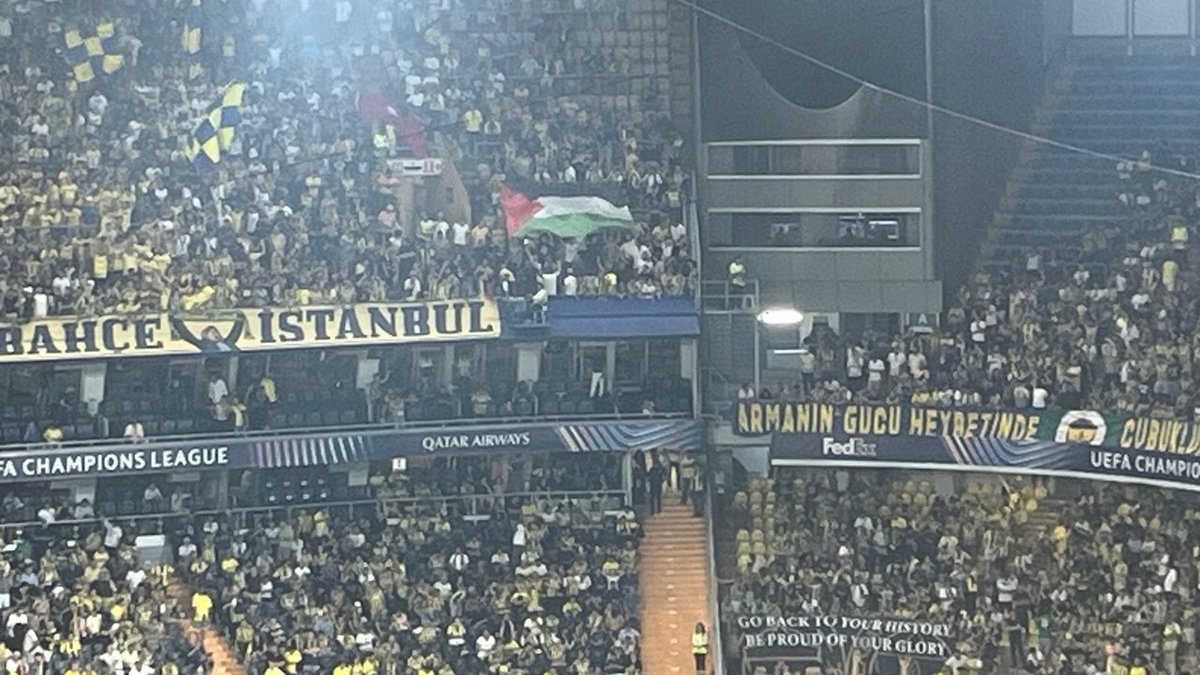 Sarı-lacivertli taraftarlar, tribünlerde Filistin bayrağı açarak İsrail’in akınlarına ve işgal teşebbüslerine karşı direnen Filistin halkına dayanak bildirisi verdi.